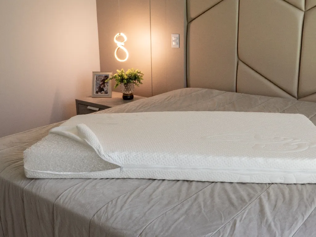 Possui capa com zíper, ultra macia em malha bamboo.